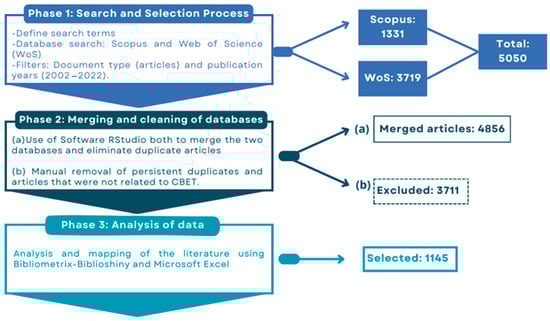 Overview of the methodology used for search, consolidation, cleaning, and data analysis of articles about community-based ecotourism (CBET) from the Web of Science and Scopus databases, from 2002 to 2022.