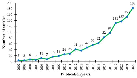 The highest scientific productivity occurred between 2019 and 2022, with a production of 604 articles, equivalent to 52.75% of the total production, with 2022 (n = 183; 15.98%) being the most prolific year (Figure 2). In contrast, the lowest academic production was recorded between 2002 and 2003, each with only 3 publications (0.26%).
