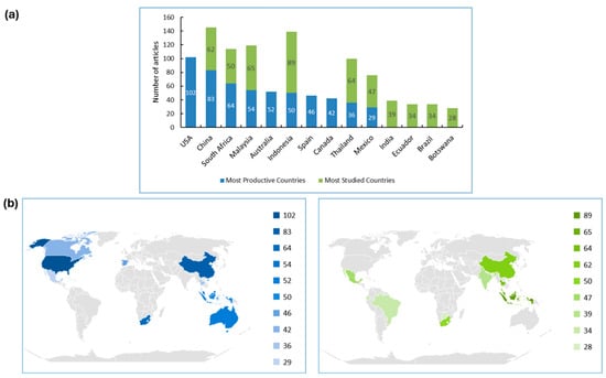 (a) Geographical distribution of the top 10 countries with the highest academic production and most studied countries regarding community-based ecotourism. (b) Choropleth maps.