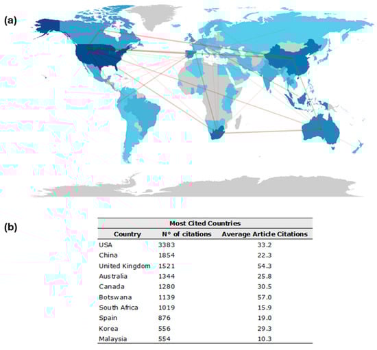 In this section, the aim was to identify the relationship between international networks of scientific collaboration among countries (Figure 5a) and the number of citations associated with CBET (Figure 5b). A choropleth map (Figure 5a) was used to represent the quantitative data associated with the areas where there is a higher frequency of collaboration between countries (more colored areas) and a lower frequency (fewer colored areas) [54], while the red lines represent the collaborative connections between one country and another. Initially, it was found that the United States emerged as a central actor in this network, with a prominent frequency of collaboration with China (7 connections), Canada (6 connections), and South Africa (4 connections). China’s active presence on the international scene is also evident in its links with Australia and Canada, each with 5 connections. South Africa, in turn, shows a notable interaction with Australia (5 connections) and the United Kingdom (4 connections), while the connections between Mexico–Colombia and Spain–Ecuador are low. These results reveal that countries with a high production of articles on CBET such as the USA, China, and South Africa act as central nodes in the scientific collaboration network related to community-based ecotourism, forming strategic scientific alliances with countries such as Canada, Australia, and the United Kingdom. On the other hand, there is also a broader and stronger collaboration among English-speaking countries compared to Spanish-speaking countries such as Mexico, Colombia, Spain, and Ecuador, which seems to function as a linguistic barrier in the establishment of collaborative networks associated with the study of CBET. In response to this, studies such as that by Tenzer et al. [83] demonstrate that language barriers significantly influence the development, participation, and communication of multinational teams. Additionally, it is found that scientific collaborations related to CBET impact the number of citations, as the most cited countries include the United States (3348), China (1854), the United Kingdom (1521), Australia (1344), and Canada (1280). In the specific cases of the USA and China, this phenomenon is also related to the high academic production on CBET (Figure 4) and also reflects the growing interest within the scientific community towards articles produced by these countries. Overall, it is confirmed that the creation of networks of scientific collaboration generates a greater number of citations compared to research conducted individually [84,85,86]. However, some authors warn that citation-based metrics could be partially biased due to self-citations by authors and their collaborators, which would increase the frequency of citation [54,86].