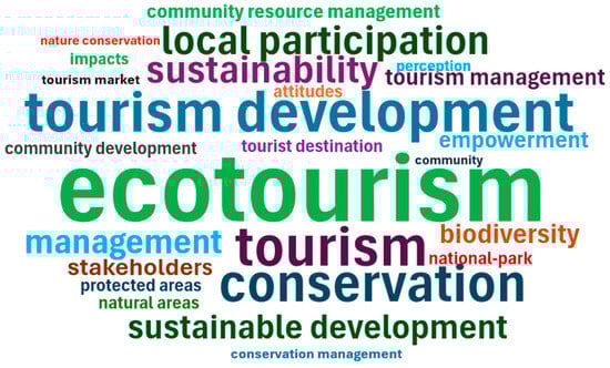 In general, keywords are considered one of the most important components of any research work, aimed at identifying the central themes of study in different fields of scientific research [87]. Figure 6 shows the top 25 keywords represented in a word cloud. Word clouds are a visual representation of the most relevant keywords from a text, where the size of each word is determined by the number of times it appears in each scientific article (frequency). In a word cloud, the most frequent words appear in a larger font size and are usually placed in the center or in prominent positions, while less frequent words are smaller and located on the edges or in less prominent areas [88]. Word clouds are useful for visualizing patterns and trends in large sets of text quickly and are easily understandable. Consistent with this, the 10 most frequent keywords associated with CBET are ecotourism (n = 308; 26.89%), tourism development (n = 169; 14.75%), tourism (n = 116; 10.13%), conservation (n = 111; 9.69%), sustainability (n = 94; 8.20%), local participation (n = 89; 7.77%), management (n = 73; 6.37%), sustainable development (n = 67; 5.85%), biodiversity (n = 66; 5.76%), and tourism management (n = 61; 5.32%), respectively. This makes sense as the most prominent keywords reflect the context in which the research was conducted [89]. Thus, the term ecotourism stands out as the predominant identifier and theme in the field of CBET given its ability to reconcile the economic and social well-being of local communities with conservation [24,90]. The importance of terms such as local participation, sustainability, sustainable development, and tourism management is also highlighted as they are part of the fundamental principles of community-based ecotourism [24,39] and focus on the effective balance of CBET at the social, economic, cultural, and environmental levels. Words such as biodiversity and conservation reflect the growing interest in nature preservation and care associated with community-based ecotourism.