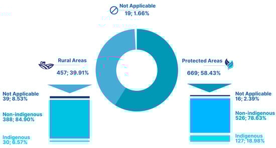Most of the studies on CBET have been conducted in protected areas (n = 669; 58.43%) (Figure 8), meaning in natural reserves, biosphere reserves, national parks, wildlife sanctuaries, and natural monuments. Within the research conducted in protected areas, it is found that the study population consists of 18.98% indigenous communities and 78.63% non-indigenous communities. On the other hand, studies in rural areas represented 39.91% (n = 457), where indigenous populations represented 6.6% and non-indigenous communities 84.90%.