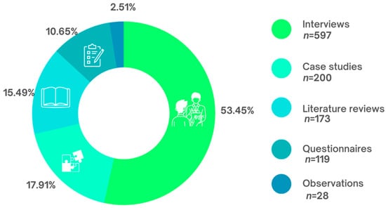 The use of interviews as the main method of data collection represents 53.45% (n = 597) of the identified studies (Figure 9). According to the analyzed articles, interviews were conducted with local communities, visitors or tourists, experts in the field, decision-makers, and other parties involved in CBET initiatives; see, for example, [76,105,108]. The importance of this method lies in its ability to explore contextualized perspectives, experiences, attitudes, and perceptions, thereby enriching and expanding the understanding of ecotourism phenomena from the viewpoint of the involved actors. On the other hand, case studies are another commonly used method (n = 200; 17.91%). These provide a detailed and specific insight into how CBET initiatives are implemented and experienced in natural areas, primarily located in Southeast Asian, Latin American, and African countries (Figure 4), coinciding with studies such as Weaver et al. [109]. This methodology allows for the examination of CBET’s impacts in various study areas distributed globally; see, for example, [77,110,111,112,113,114].