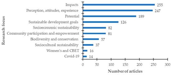 Research focuses of scientific publications on community-based ecotourism (CBET) (2002–2022). The top 10 most frequent focuses are graphed.