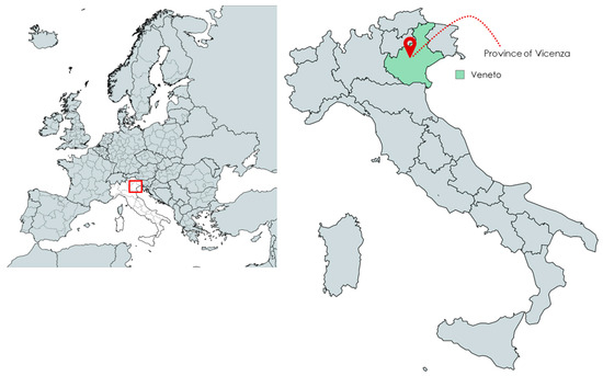 Lentil price and characteristic data were collected on 228 valid observations of packaged lentils presented on the shelves and sold in all 20 retail stores (i.e., 6 hypermarkets, 4 supermarkets, 3 small supermarkets, 2 organic shops, and 5 discount stores) in the city area of Vicenza (Italy) between November 2022 and December 2022 (Figure 1).