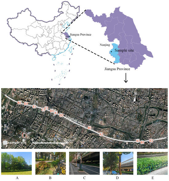 Nanjing, situated in the lower reaches of the Yangtze River, possesses a coastline and a subtropical monsoon climate, characterized by distinct four seasons, with relatively short spring and autumn periods and prolonged winters and summers. The city exhibits a moderate temperature range and receives ample rainfall. Serving as the central hub of the Yangtze River Delta region, Nanjing boasts one of the highest urbanization rates (Figure 1). Consequently, urbanization significantly impacts the local climate of Nanjing and the wider Yangtze River Delta. The chosen sampling point for this research lies on Ying Tian Avenue in Jianye District, Nanjing, at coordinates 118°46′1.78″ E and 32°1′8.17″ N. Ying Tian Avenue spans approximately 6.5 km in a north–south direction and is flanked by high-density buildings, hosting a dense population. The road is characterized by heavy traffic flow (during peak hours, the traffic volume on the ramp is 1900 cars per hour) and serves as a bustling metropolitan corridor. Commercial and office buildings dominate the area, accommodating an array of pedestrians and diverse vehicle types. The presence of diverse tree species and an overhead bridge further exemplify its typicality as an urban road in Nanjing.