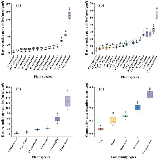 Average dust retention per unit leaf area of plants and different community structure dust retention. (a) is dust retention per unit leaf area of tree. (b) is dust retention per unit leaf area of shrub. (c) is dust retention per unit leaf area of grass. (d) is dust retention per unit leaf area of community structure. a–j represent different levels of significance.