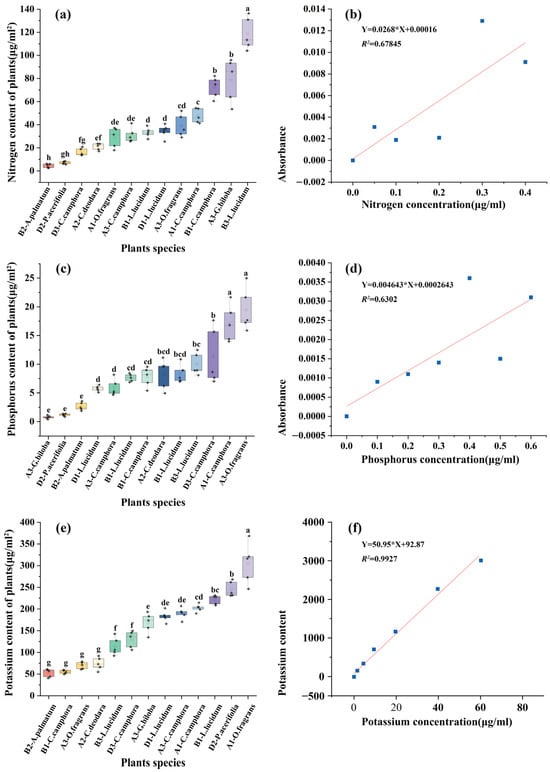 Plant leaf nitrogen, phosphorus, and potassium content, and standard curve. (a) is nitrogen content of plants. (b) is nitrogen contentration standard curve. (c) is phosphorus content of plants. (d) is phosphorus contentration standard curve. (e) is potassium content of plants. (f) is potassium contentration standard curve. a–h represent different levels of significance.