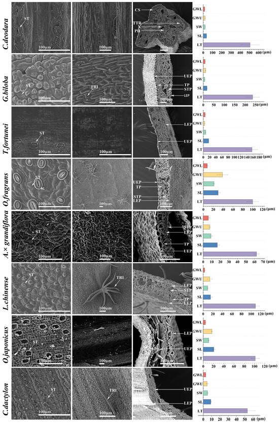 Electron micrographs of eight typical plant species. LF: Leaf Thickness; SL: Stomatal Length; SW: Stomatal Width; GWU: Upper Epidermal Groove Width; GWL: Lower Epidermal Groove Width; ST: Stomata; UEP: Upper Epidermis; LEP: Lower Epidermis; TP: Palisade Tissue; STP: Spongy Tissue; CS: Collenchyma Strand; TTR: Transfusion Tissue; X: Xylem; PH: Phloem; TRI: Trichomes. C. deodara is a coniferous plant, and its leaf structure is different from that of broadleaf plants; hence, the leaf annotations are different from those of other broadleaf plants.