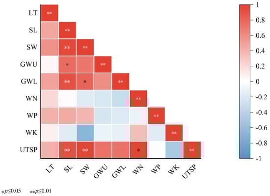 Analysis chart illustrating the correlation between leaf surface microstructure, nitrogen, phosphorus, potassium content, and dust retention ability. LF: Leaf Thickness; SL: Stomatal Length; SW: Stomatal Width; GWU: Upper Epidermal Groove Width; GWL: Lower Epidermal Groove Width; TP: Stomata; WN: Nitrogen Content; WP: Phosphorus Content; WK: Potassium Content; UTSP: Dust Retention per Unit Leaf Area.