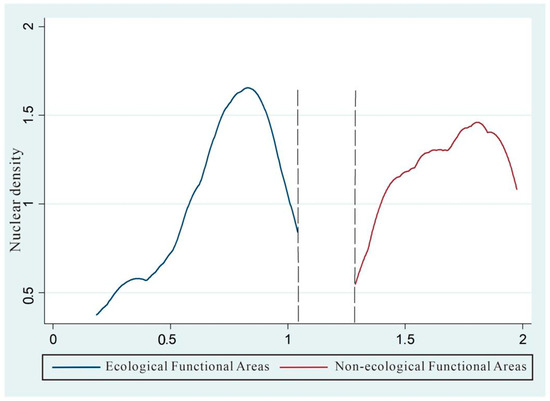In Figure 1, there is a significant difference between the nuclear density estimation curve of the value of the ecological functional areas and the non-ecological functional areas in 2001–2015, and the social capital level of the ecological functional areas is significantly lower than that of the non-ecological functional areas. This gives intuitive evidence of the difference in social capital that leads to the income gap between the two regions.