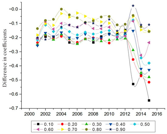 Figure 2 shows the difference in the regression coefficients of social capital on rural income between ecological and non-ecological functional areas. The difference in coefficients highlights negative characteristics; that is, the income effect of social capital in ecological functional areas is lower than that in non-ecological functional areas. Since 2004, especially in the 2005–2010 and 2013–2015 periods, the coefficients difference has increased overall under quantiles = 0.1, 0.2, 0.3, 0.4. It is worth mentioning that the largest coefficient differences are found between 2013 and 2015. The coefficient differences averaged over the 2013–2015 period amounted to −0.55, −0.45, −0.40 and −0.33 for quantiles = 0.1, 0.2, 0.3 and 0.4, respectively. This result predicts the largest differences between the two sectors between 2013 and 2015 among the low-income groups. It is clear that the policies implemented by the Chinese Government on fiscal transfers and payments in the key ecological functional areas have not narrowed the gap in the income effects of social capital between the low-income groups in the two sectors, but rather the difference is more obvious. In relative terms, the regression coefficient of social capital under quantiles = 0.5, 0.6, 0.7, 0.8 is small and decreases with the increase in quantiles, which shows that the income effect of social capital between high-income groups in the two sectors is small. However, there is no significant sign that the difference decreases. The years 2013–2015 are used as an example for illustration. When the quartile = 0.5, the value of the coefficient difference increases from 0.075 in 2013 to 0.379 in 2015; when the quartile = 0.6, the value of the coefficient difference increases from 0.083 in 2013 to 0.234 in 2015; when the quartile = 0.7, the value of the coefficient difference increases from 0.050 in 2013 to 0.152 in 2015; and when the quartile = 0.8, the value of the coefficient difference changes from 0.043 in 2013 to 0.157 in 2015.