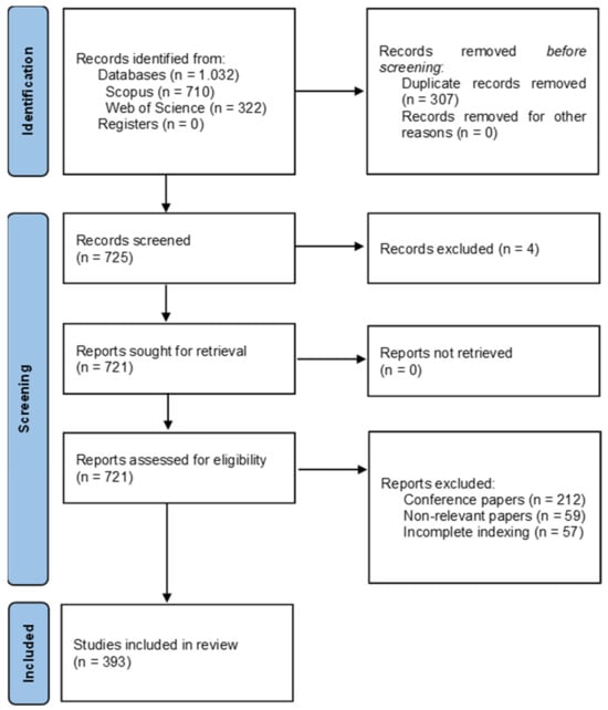 The flow chart illustrates the initial step in which 1032 documents were identified. Out of these, 307 duplicate documents were removed. Subsequently, three exclusion phases were conducted based on the established criteria, resulting in a total of 393 documents that were analyzed using bibliometric methods.