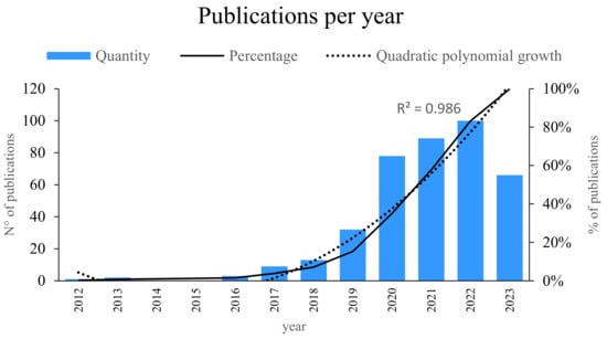 The metric ‘publications per year’ displays the trend of the number of works published in a specific research field over time. Figure 2 illustrates the studies conducted since 2012, with an exponential growth of approximately 98% until 2023. It is noteworthy that the most significant years were 2021 and 2022, with 2022 having the highest number of scientific publications on the IoT and sustainability. One notable publication is [22], which presents a smart IoT framework enabled by blockchain and artificial intelligence for the development of sustainable cities. Similarly, another study proposed a sustainable smart photobioreactor for the continuous cultivation of microalgae using IoT technology [23].