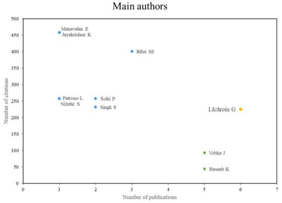 The analysis that follows measures the number of articles and citations of the main authors, as shown in Figure 3, to determine the main research references. Lăzăroiu G stands out as one of the main references in terms of scientific productivity and academic impact in the field of IoT use in sustainability practices. The scientific community widely recognizes his contributions due to the high number of publications and citations he has accumulated throughout his career. Some of his studies relate to his scientific productivity, conducting extensive research on Internet of Things sensing infrastructure and data-driven planning technologies in the governance and management of sustainable smart cities. The author’s research offers valuable insights into how IoT capabilities can optimize decision-making processes and improve efficiency in city management [30].