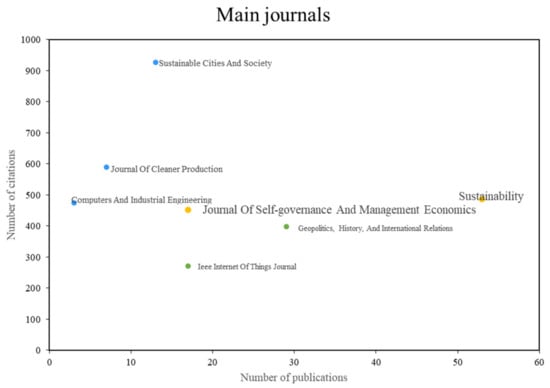 The journal Geopolitics, History, and International Relations is known for its remarkable scholarly productivity in the field of sustainable practices related to the IoT. While it may not be widely recognized for its scholarly impact in terms of citations, its high number of publications is noteworthy. This journal features articles that comprehensively address the intersection of geopolitics, history, international relations, and the use of the IoT in building smart and sustainable cities. For instance, ref. [41] discusses how to address the COVID-19 crisis by leveraging IoT sensors and machine learning algorithms in data-driven smart cities. This study offers insight into how emerging technologies can contribute to crisis management and building more resilient and sustainable cities. The journal Geopolitics, History, and International Relations has played an important role in providing a space for the publication of relevant and novel research in this area, although its academic impact in terms of citations may be limited.