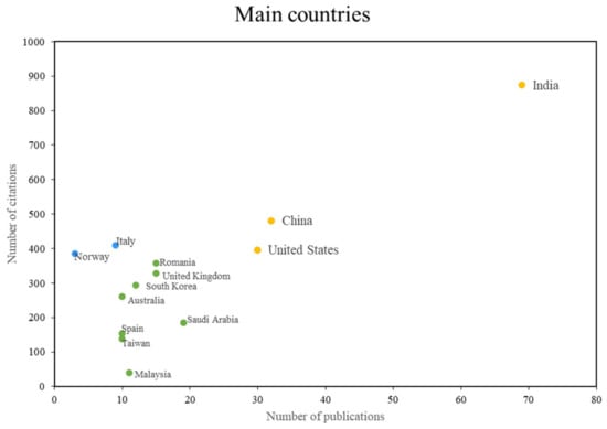 Figure 5 identifies the main countries producing knowledge around the use of the IoT in sustainability practices, comparing the number of citations and publications on the topic. India, China, and the United States stand out as the main references in terms of scientific productivity and academic impact in the field of sustainable practices related to IoT. The article by Yadav et al. [43] demonstrates India’s significant contributions in this area. This article presents a model for achieving global sustainability in the multi-tiered agri-food supply chain through the use of IoT technology, particularly in the context of natural epidemic outbreaks. The study addresses key challenges in combining the IoT with sustainable supply chain management and provides valuable insights for improving resilience and efficiency in this critical sector. Additionally, the article highlights India’s commitment to promoting sustainable practices through the use of emerging technologies.