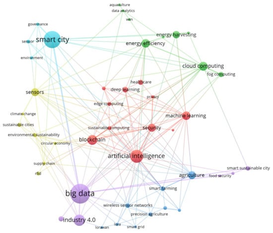 The cluster centers around artificial intelligence and includes terms such as blockchain, sustainable computing, security, machine learning, privacy, deep learning, health care, and edge computing. These terms represent the latest technologies that are part of the recent industrial revolution and enable the integration of IoT devices in various industrial sectors and urban development [59]. These technologies are primarily integrated to develop models that collect data and generate predictive intelligent models. Therefore, in this case, they function as enabling technologies in smart cities [40].