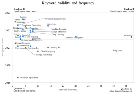 Figure 8 shows the validity of the key terms discussed in the document using a 2 × 2 matrix. This graph displays the behavior of keywords, considering their temporality and frequency of use in research on the studied topic. The first quadrant contains the most recent and established terms. Regarding the topic of sustainable cities and the IoT, the term used to describe the first quadrant is smart city. This term is used throughout the document, and the research focuses on the use of IoT devices and how to improve them for use in the construction of smart and sustainable territories [1,6,65].
