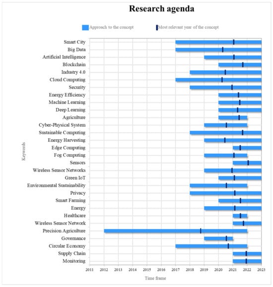 Research on sustainability has developed in response to social, economic, and academic priorities. Investigative approaches are tailored to the demands and needs of the time. Figure 6 shows the thematic evolution of research on IoT and sustainability over time. The thematic evolution can be observed by analyzing the most frequently used keyword for a given year. In 2012, the most common term was ‘system level approaches’, which investigates the role of the Internet of Things in agricultural systems. The focus was on using the IoT to facilitate sustainable agriculture, understand and support biodiversity management, and manage natural resources such as irrigation water. Finally, ref. [51] presents recommendations for the future development of policies and research strategies to enhance the use of ICT in the agricultural sector.