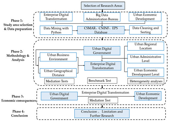 This study is structured into four distinct phases, illustrated in Figure 2. In Phase 1, this study systematically examines the mechanism of digital government for urban economic development from the perspective of digital government construction to enhance the digital transformation of enterprises. It enhances the comprehensive understanding of the economic effects of the widespread application of digital technology. In Phase 2, benchmark regression analysis, mediation tests, and heterogeneity analysis are conducted as integral components of this study. Phase 3 delves into the economic ramifications stemming from urban digital governance at the municipal level. Finally, Phase 4 encapsulates the study’s conclusion, highlights its limitations, and provides a forward-looking perspective on potential future research directions.