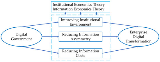 The theoretical analytical framework is shown in Figure 3. The digital transformation is the inevitable path for enterprises to explore the value of data elements and enhance competitiveness [44]. According to the theories of institutional economics and information economics, the role of digital government can be interpreted from the perspectives of institutional environment, information asymmetry, and information cost. On one hand, digital government improves the institutional environment by enhancing regional digital infrastructure, implementing supportive policies, and strengthening technical and human resources [45]. According to institutional economics theory, this stimulates the enthusiasm of enterprises for digital transformation. On the other hand, digital government breaks down the “information silos” [46], reduces information asymmetry, and lowers enterprise information costs. The government has the ability to collect data resources from different types of enterprises and different hierarchical organizations; integrate and redistribute the data resources needed by enterprises; alleviate the dilemma of data monopolies; and provide enterprises with sufficient, timely, accurate, and low-cost data resources. Based on the above analysis, this paper proposes hypothesis H1: