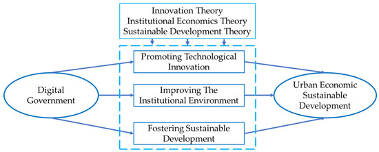 The theoretical analytical framework is as shown in Figure 4. The digital government has a significant impact on the sustainable development of urban economies, and its role can be explained using theories of innovation, institutional economics, and sustainable development. Firstly, according to innovation theory, much of the driving force behind sustainable urban economic development comes from technological innovation. However, the inherent uncertainty and the demand for significant resource inputs, including capital investment, pose significant challenges [55]. Digital government may facilitate technological innovation and development by opening up data, providing financial support, and offering technical training [38]. Its emergence also brings about new business models and market opportunities, stimulating demand and investment in technological innovation by enterprises. Secondly, according to institutional economics theory, digital government makes governments more transparent and efficient, providing enterprises with a more stable and reliable institutional foundation, reducing uncertainty in economic operations, and facilitating long-term investment and planning. Lastly, sustainable development theory emphasizes the coordination and balance among social, economic, and environmental aspects. Digital government provides more information and data resources, enabling governments to more effectively monitor and manage various aspects of society, the economy, and the environment. This contributes to formulating more scientific and sustainable policies and plans, promoting the achievement of economic sustainable development goals in resource utilization, environmental protection, and social equity. Therefore, the following hypothesis is proposed:
