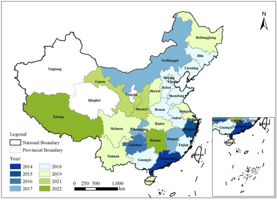 Cities that have established big data administration bureaus (local big data administration bureau established according to data compiled from official provincial government websites: Guangdong, 2014; Zhejiang, 2015; Guizhou, 2016; Jiangxi, Chongqing, and Inner Mongolia, 2017; Shanghai, Beijing, Fujian, Shandong, Tianjin, Anhui, Henan, Hebei, Guangxi, Jilin, and Liaoning, 2018; Jiangsu, Hubei, Hainan, Heilongjiang, Yunnan, Sichuan, and Shanxi, 2019; Shaanxi and Gansu, 2021; Hunan and Tibet, 2022).