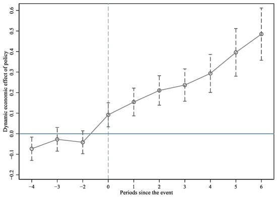 The parallel trend test is the basic premise of using the multi-period DID econometric model for testing research hypotheses. To ensure that the regression results are caused by the policy shock of “the establishment of the urban big data administration bureau”, referring to the research of Beck et al. [60], we constructed dummy variables for four years before and six years after the implementation of the policy to examine the dynamic effect of digital government on the level of enterprise digital transformation. As shown in Figure 6, in the two years and three years before the establishment of the urban big data administration bureau (−2 and −3), the coefficients both intersect with y = 0 axes, indicating that there is no significant difference between the treatment and control groups. During the year of the policy and after (0 to 6 years), there was significant positive growth in the digital transformation of enterprises, which passed the parallel trend test. The above regression results indicate that digital government enhances the level of enterprise digital transformation, and the policy impact is highlighted during the policy year.