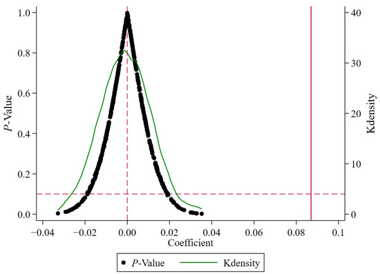 Unobservable random factors and omitted variables may lead to endogeneity in the baseline regression results. This study conducted a placebo test of the impact of digital government on the digital transformation of enterprises, with 1000 randomly selected experimental and control groups. Figure 7 depicts the distributions of the coefficients and p values of the core independent variables formed by the 1000 virtual regressions. The results show that the regression coefficients of digital government are concentrated near the value of 0, and the vast majority of the values are more than 10%, which indicates that the regression results are not significant. As shown in Figure 7, the regression coefficients of 0.087 (Table 3, Column 2) for digital government in the benchmark model are outliers in the estimated coefficients in the placebo test. Therefore, the benchmark regression results are not seriously biased due to random factors and omitted variables.