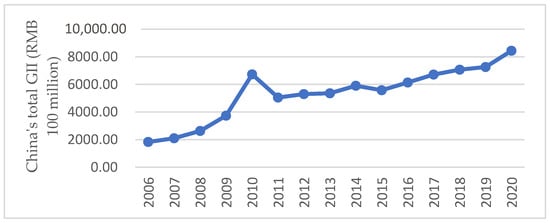 3]. The green industry is a key means to achieve green, low-carbon, and sustainable development. In the urban development process, the green upgrading of infrastructure plays an important role. Green infrastructure investment (GII) refers to a category of investment in sustainable and environmentally friendly infrastructure projects. It aims to address the shortcomings of existing infrastructure and promote economic growth and social wellbeing while reducing the negative impact on the environment. From 2006 to 2020, China’s GII total showed an overall upward trend, with an average annual growth rate of 13.71% (