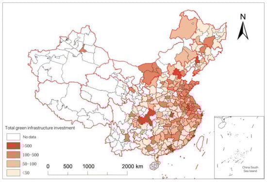 In this section, the total GII in Chinese cities in 2006–2019 was grouped into more than RMB 50 billion, RMB 10–50 billion, RMB 5–10 billion, and less than RMB 5 billion, and its geographical distribution characteristics were observed. The results showed the unbalanced distribution of GII in Chinese cities. Cities with the highest investment levels are mainly concentrated in municipalities such as Beijing, Tianjin, and Chongqing. Cities with relatively high investment levels are mainly located in eastern coastal regions. Meanwhile, cities with lower investment levels are primarily distributed in central, western, and northeastern regions (