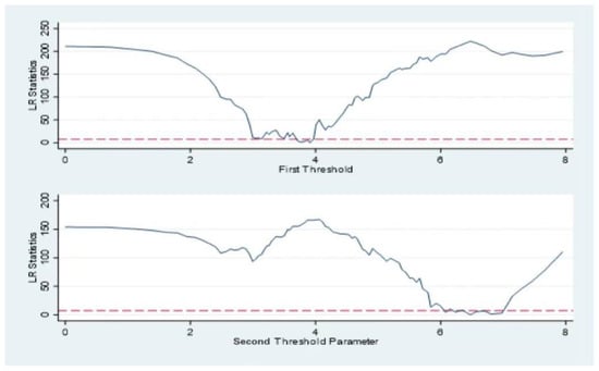 Table 13). The threshold was 3.666 and was significant at the 95% confidence interval [3.575, 3.756]. Next, the samples were divided into two groups for dynamic panel regression based on the threshold value 3.666 (
