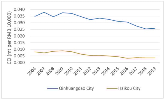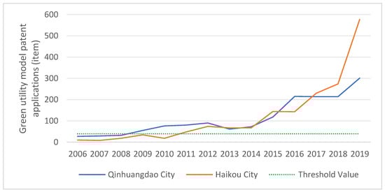 Figure 6. The TP, represented by the number of green utility model patent applications, in Qinhuangdao City gradually exceeded the threshold value after 2008. During the period when Qinhuangdao City’s TP had not reached the threshold value, its CEI exhibited significant fluctuations, indicating that the carbon reduction effect had not yet been realized. However, from 2009 onwards, its CEI started to decline. In addition, in the case of Haikou City, its TP exceeded the threshold value after 2010, and the turning point of CEI was also in 2010: the CEI of Haikou remained relatively stable between 2006 and 2010, and began to decline significantly from 2010. Such a reality is consistent with the conclusion drawn by the above threshold regression, indicating that TP has a threshold effect on the process of carbon emission reduction.