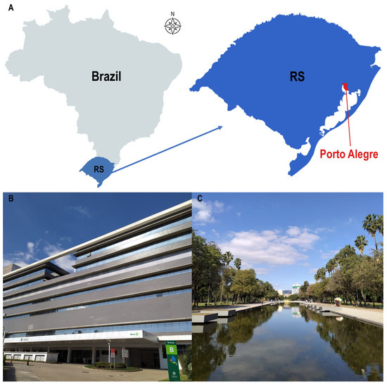 Location of Porto Alegre city in Rio Grande do Sul State, Brazil (panel (A)). Examples of Porto Alegre’s natural and scientific atmosphere: Hospital de Clínicas de Porto Alegre, a reference institution in medical treatment, teaching, and research in Brazil, an institution linked to the Federal University of Rio Grande do Sul (UFRGS) (panel (B); photo: J.H. Ellwanger). Landscaping of Park Farroupilha (Parque Farroupilha, popularly known as “Redenção”), one of Porto Alegre’s several “green islands” (panel (C); photo: J.H. Ellwanger).