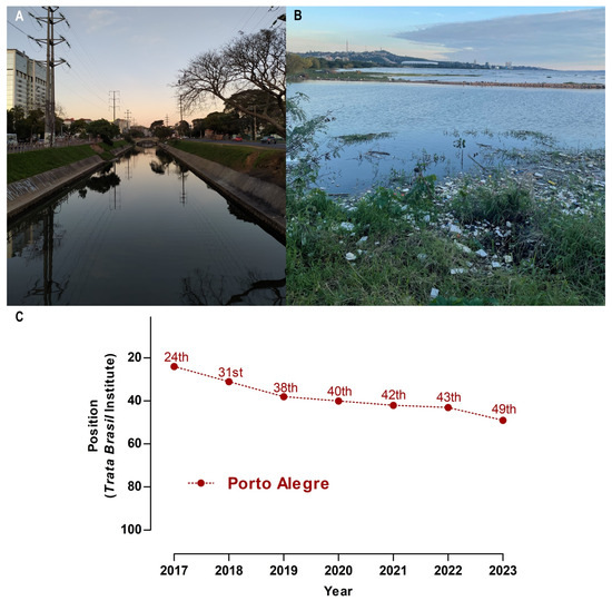 Examples of Porto Alegre’s pollution. Stream Dilúvio in Porto Alegre is heavily contaminated by sewage disposal, flowing into Lake Guaíba (panel (A); photo: J.H. Ellwanger). Improper disposal of solid waste in Lake Guaíba (panel (B); photo: M. Ziliotto). Porto Alegre’s positions in the sanitation ranking of the Trata Brasil Institute from 2017 to 2023 (panel (C)) [24,26,27,28,29,30].