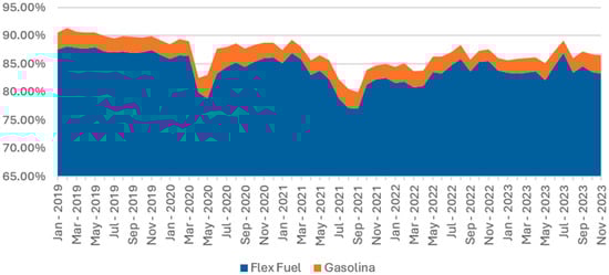 However, in Brazil, the popularity of flex-fuel vehicles stands out. These vehicles are designed to operate on different proportions of gasoline and hydrated ethanol, allowing drivers to choose the most cost-effective fuel at the time of refueling. In November 2023, flex-fuel vehicles represented 82% of the light vehicle fleet in Brazil, while gasoline vehicles accounted for a percentage of 3.3%, confirming the competitiveness of ethanol compared to gasoline. One of the main reasons for the success of this type of engine, used by major vehicle manufacturers in Brazil, is the abundance of sugarcane in the country. Sugarcane is the primary raw material for ethanol production, presenting itself as a cleaner and renewable alternative compared to gasoline. On the other hand, the benefits of flex-fuel vehicles include reducing dependence on fossil fuels, decreasing greenhouse gas emissions and promoting a more sustainable energy matrix. In Figure 1, the demand for Flex vehicles in Brazil from 2019 to 2023 in comparison to gasoline can be observed [8], which demonstrates the consolidated market for this type of vehicle in Brazil.