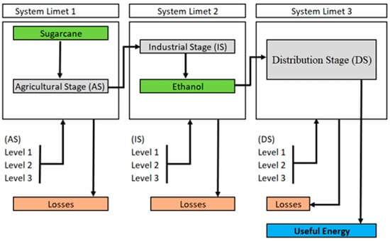 The energy consumed in the industrial stage is presented as a function of the sum of energy consumption in three levels of regression: (a) Level 1i—Energy required for the ethanol production process; (b) Level 2i—Energy embedded in the necessary inputs for ethanol production; and (c) Level 3i—Energy required for the construction of buildings and industrial equipment, as well as the maintenance of the equipment involved.