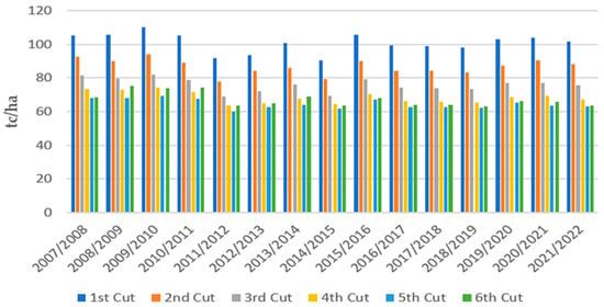 Sugarcane is a plant that generally supports six cuts, and its composition is an inherent variable in the production process and susceptible to the season of the year, showing changes from one season to another. The potential of sugarcane residues in terms of dry matter is around 14% of the mass of the stem, which means that for each ton of stems, there are 140 kg of dry residues. Experiments carried out show a significant difference that can be observed between the average value of 14% and an average value of 18.2%. However, this can be explained mainly by differences in methodology and experiments that do not consider the effect of moisture content and the cutting stage, as well as the differences between the varieties considered [14]. Regarding the amount of water available in sugarcane, this value can vary between 65% and 75% [15,16]. In addition to Figure 3, Table 1 presents the maximum and minimum productivity values per cut, as well as the percentages of sucrose, fiber, and straw considered in this work.