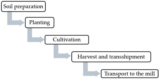 During the agricultural stage, the practices used may vary according to regional characteristics, such as soil, water availability, and soil inclination, among other factors influencing the management to be adopted. In Figure 4, the process flow of the agricultural stage can be seen in a simplified way [3].