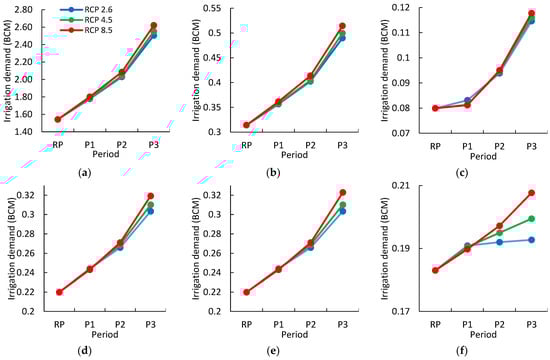 The results computed by CROPWAT-8 showed an increase in the projected irrigation demand in response to climate change (Figure 3a–n). In the RP, the annual irrigation water released from the Tigris River for irrigation requirements was 28.70 BCM. This magnitude tends to increase to 31.54, 34.33 and 39.63 BCM under RCP 2.6 for P1, P2 and P3, respectively. However, under RCP 4.5 (RCP 8.5) the annual irrigation water demand is expected to increase to reach 31.73, 34.58 and 40.32 (31.81, 34.97 and 40.76) BCM for P1, P2 and P3, respectively.