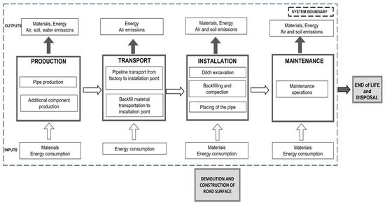 A functional unit (FU) serves as the criterion for comparing distinct phases by establishing relationships between inputs and outputs [18]. In an LCA for water supply infrastructure, inputs are used as the FU [21]. For this research, the choice of FU is one meter of water supply infrastructure with a life span of 40 years. The life span of the water pipelines at 40 years was selected in accordance with the minimum Italian legislative criteria and the guidelines of the multi-utility water company. This value ensures a safe pipe life span, although in practical cases, the pipes may last longer than the selected life span. A cradle-to-gate comparative analysis drove the assessment, starting from the pipelines’ production to their maintenance phase, excluding the end-of-life and disposal stages.