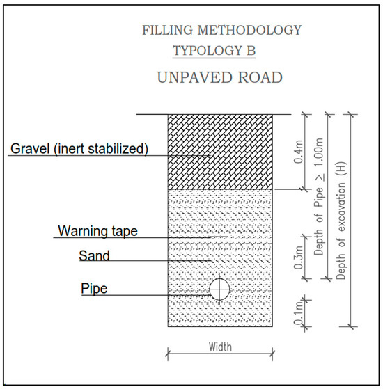 The installation phase consists of trench excavation, sand bedding, laying of the pipe, backfilling, and compaction of the surface course. The dimensions of the trench are presented in Figure 3. In all cases, the trench was considered to be vertical. The specifications of the trench and thickness of the bed were indicated by the waterworks company guidelines and are shown in Figure 3. The depth of pipe was taken as 1 m from the ground surface to the top of the pipe. The pipe depth is based on the guidelines provided by the multi-utility company, and it is applicable throughout the Emilia-Romagna region in Italy. The pipes were assumed to be laid under unpaved road. Gravel was used for bedding, whereas sand was used for backfilling.