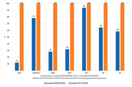 The potential environmental impacts associated with each plastic water pipeline considered are shown in Figure 4 and Figure 5. The results show that the HDPE pipe was the most environmentally friendly alternative for all the seven impact categories for the 90 mm diameter pipe, and in six out of seven impact categories for the 125 mm diameter pipe (except photochemical oxidation).