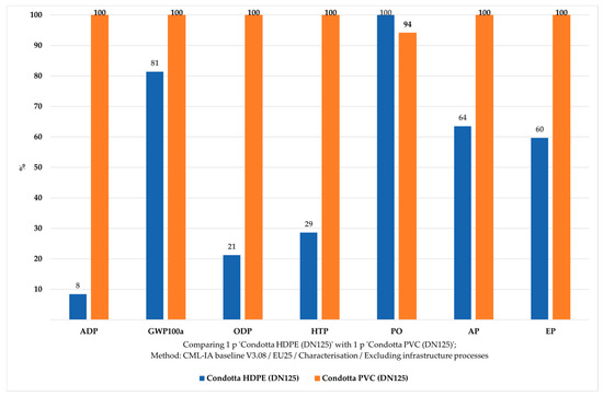 The contribution of the 125 mm diameter PVC pipe to GWP was 17.8 kg CO2 eq compared to 14.5 kg CO2 eq for HDPE pipe. Considering the 90 mm diameter pipes, the values for the 125 mm diameter pipes were reduced by 26% for the PVC pipe and 29% for the HDPE pipe. HDPE pipes are environmentally sustainable options to replace PVC pipes for the water supply in this Italian metropolitan city.