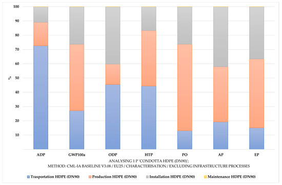 Figure 6 illustrates the contribution of each life cycle stage to the environmental impact categories for the 90 mm diameter HDPE pipe. The same trend of results was obtained for the 125 mm diameter HDPE pipelines.