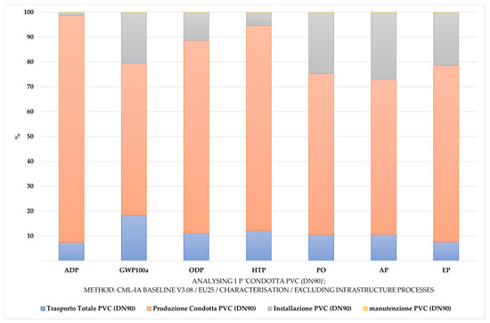 Figure 7 indicates that the production phase is the largest life cycle impact stage in all categories. The production phase of PVC 90 mm diameter pipe contributes between 61 and 91% in all impact categories. The installation phase contributes 1–27% of all the impact categories, whereas the transportation phase contributes 7–18% of all the impact categories. The maintenance phase has an insignificant contribution of less than 1%.