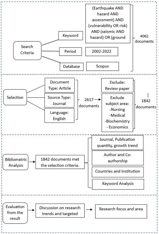 Bibliometric analysis has gained popularity as a useful tool for assessing the quality of scientific output [4]. In the geotechnical field, bibliometric studies on settlement research [5], landslide susceptibility research [6,7], and soil erosion study [8] have been carried out, but no research on seismic hazard assessment has been conducted. The significance of this approach lies in its ability to provide a comprehensive and systematic overview of the existing body of knowledge. In this context, bibliometric analysis plays a pivotal role in mapping the landscape of earthquake hazard assessment research. It helps identify influential publications, prolific authors, key institutions, emerging research trends, and critical gaps in the literature. By scrutinising citation patterns and co-authorship networks, researchers can gauge the impact and dissemination of findings within the scientific community. There are various benefits to using bibliometric approaches in the analysis. First, a thorough comprehension of the research subject is not required. Secondly, they are regarded as ‘objective’ since their cognitive career is not shaped by the interpretation of a researcher. Finally, they are predicated on decisions the researcher made at the moment while doing the research [9]. Researchers employ bibliometric analysis for several purposes, including identifying new trends in the performance of articles and journals, patterns of collaboration, and the components of research, as well as investigating the intellectual framework of a particular field in the body of the existing literature [3]. Additionally, bibliometric analysis enables the monitoring of how research progresses and changes over time, enabling researchers to discern shifts in emphasis and focus within the field. This method aids in informed decision-making by highlighting areas that require further investigation, facilitating the allocation of resources, and fostering collaboration among researchers. Thus, bibliometric analysis provides valuable insights into the current state of earthquake hazard assessment research and serves as an indispensable tool for shaping its future trajectory and enhancing its effectiveness in addressing the complex challenges posed by seismic hazards.