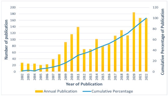 Annual and cumulative percentage of publication.