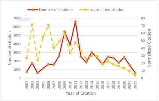 Figure 4 displays the overall number of citations and the citations normalised per article in the context of seismic hazard assessment research spanning 2002 to 2022. These publications collectively garnered a total of 48,923 citations. The chart reveals a fluctuating growth pattern characterised by several fluctuations in annual citation counts over the years. The year 2011 saw the highest total citations, amounting to 6620, whereas 2022 had the lowest, with just 649 citations. Notably, articles published in earlier years tended to receive more citations than more recent publications, which is understandable, as it takes time to accumulate references. On the other hand, the years 2003 and 2006 had the highest normalised citations per article, averaging 71 citations, while 2022 had the lowest, with only three normalised citations per paper. Figure 4 and Figure 5 demonstrate that more publications are created throughout time, but the average number of citations per article declines from 2012 to 2022. This is because as a field develops and matures, more scholars participate, resulting in a greater number of published papers. However, this increase in publications does not necessarily imply that the overall effect of the research rises accordingly.
